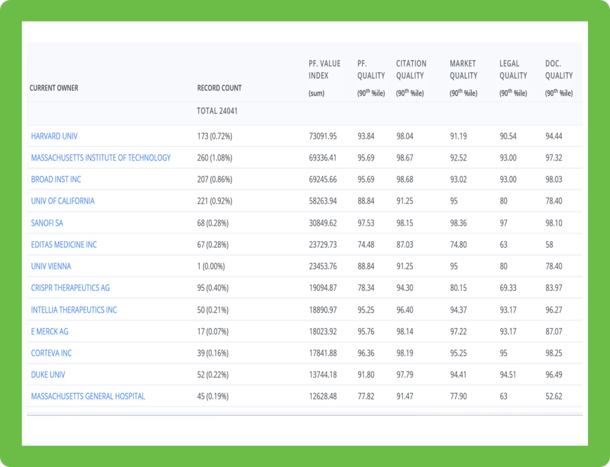 PatSeer Pro X yhdistää patentti-, business- ja legaali-informaation ja PatSeerin Scoring- mallinnus käyttää yli 40 erilaista laatuparametria, jotka yhdessä antavat tarkan kuvan markkinoiden haastajista, markkinajohtajista sekä nichè-pelureista.